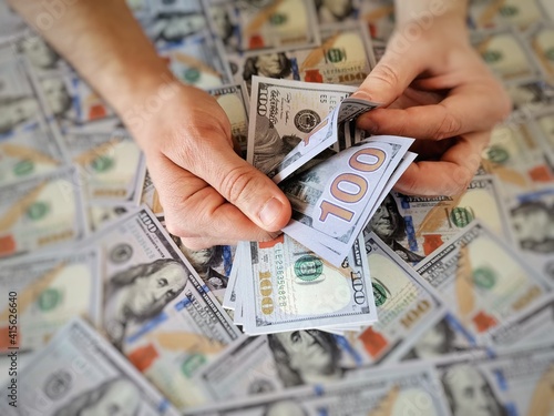 American dollar background. Hand counting money. Hand counting hundred dollars. Economy and finance.