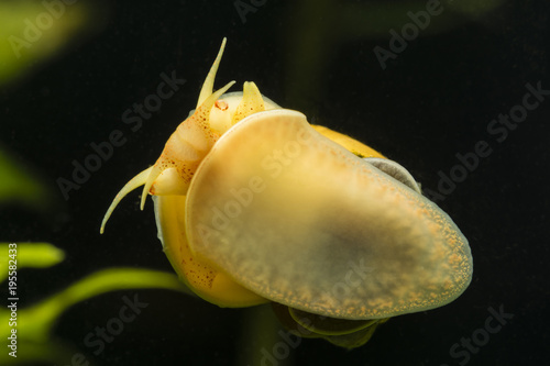 Ampullaria australis - bladder, yellow snail climbing the glass.