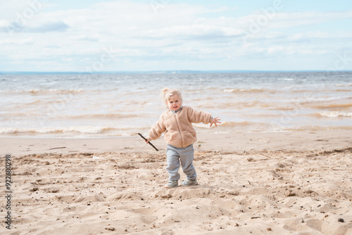 An adorable little toddler is walking along an empty cold beach, a beautiful landscape and a cute childhood concept, northern cold nature