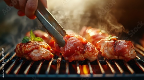 An appetizing image of juicy meat grilling over an open flame showcases the art of cooking, embodying summer gatherings and the joy of shared meals with loved ones.