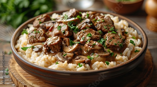 An artistic presentation of beef stroganoff, with tender beef, mushrooms, and onions in a rich sour cream sauce, served over a bed of rice.