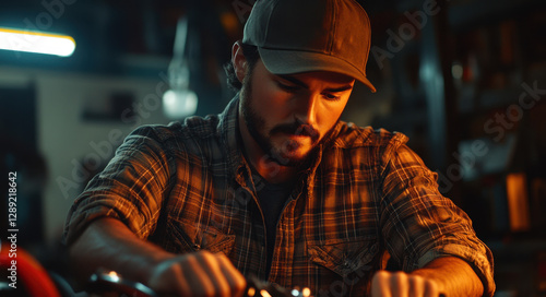 motorcycle, repair, garage, evening, mechanic, tool, focused, work, lighting, craftsmanship, hand, concentration, vehicle, gear, skill, ambience, rustic, oil, metal, design, automotive, hobby, workshop, passion, dedication, creativity, engine, maintenance, determination, talent, style, cap, environment, setting, equipment, performance, tuning, innovation, aesthetic, darkness, glow, warmth, precision, hardware, safety