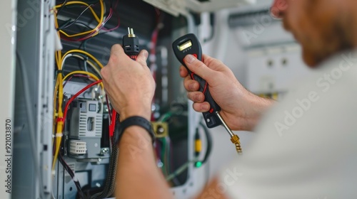 An electrician holding a screwdriver and multimeter - Caucasian electrician man wearing a white t-shirt