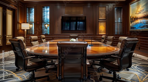 An elegant boardroom featuring a large oval conference table, plush executive chairs, state-of-the-art presentation equipment, contemporary decor, and soft ambient lighting,