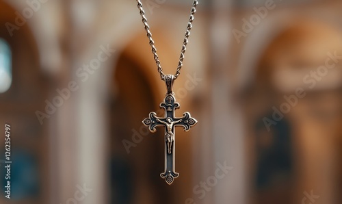 An elegant cross pendant featuring intricate hand-carved details with an intricate cross engraving concept. Generative AI