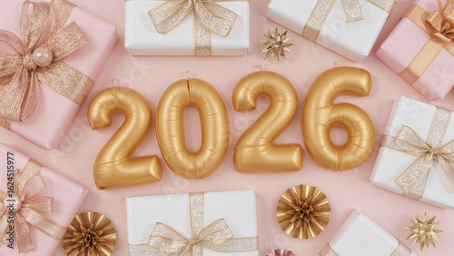 An elegant festive setup with gold candles forming '2026', surrounded by tastefully wrapped gifts topped with shimmering bows and white paper decorations.