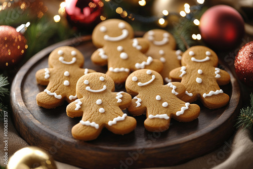 An elegant top view of perfectly iced gingerbread men cookies on a dark wooden platter, surrounded by bright and shiny Christmas ornaments, creating a cheerful holiday scene full of warmth.
