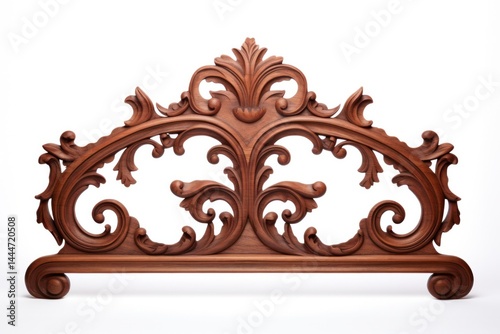 An elegant wooden bedroom headboard with intricate carvings and a polished finish, placed against a white wall