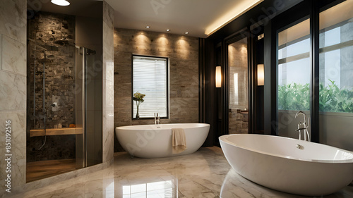 bathtub, bathroom, luxury, modern, white, home, design, wall, interior, background, illustration, floor, stylish, clean, contemporary, house, indoor, furniture, apartment, sink, bathe, empty, room, space, decoration, mirror, minimalist, table, style, render, concept, ceramic, beautiful, faucet, light, architecture, hygiene, minimalism, template, comfortable, blank, basin, privies