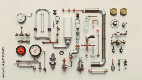 An intricate display of various pipes, gauges, and valves arranged artistically on a neutral background, showcasing industrial elegance.