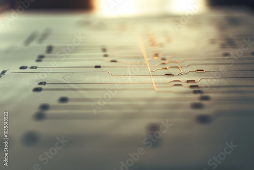 An intricate, futuristic circuit board design glowing with energy, symbolizing innovation and technology, bathed in warm ambient light and modern aesthetic.