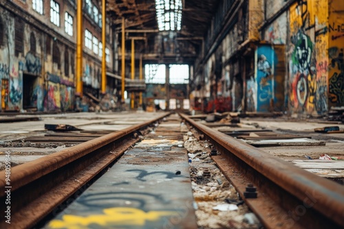 An old, derelict warehouse with exposed beams, broken windows, and walls covered in vibrant graffiti, providing a stark contrast against the industrial decay.
