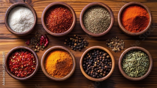 An overhead shot of various spices, including chili powder, arranged in small bowls on a wooden countertop, highlighting the rich colors and textures.