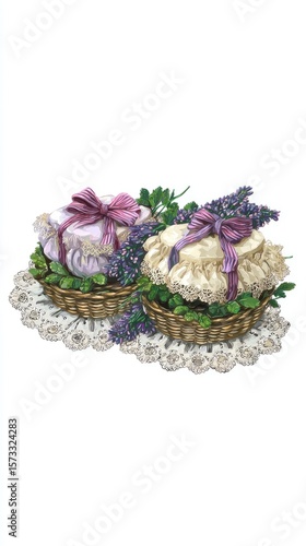 An ultra-realistic digital art of two wrapped soaps, one in lavender and the other with a purple ribbon on top