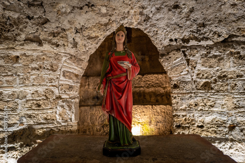 Ancient Stone Alcove Houses a Regal Statue of a Queen in Red and Green Robes