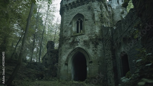 stone, tower, entrance, forest, tree, foliage, leaf, green, archway, doorway, window, overgrown, abandoned, ruin, mossy, old, weathered, rustic, mysterious, gothic, dark, shadow, nature, timberland, castle, historical, building, architecture, structure, wall, brick, ivy, hidden, secret, enchanted, magical, forgotten, unexplored