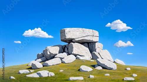 rock, stone, landscape, hill, grass, blue skies, cloud, nature, scenery, ancient, tranquil, formation, sunlight, green, peaceful, heritage, geologic, scenic, wilderness, bright, natural, textured, unique, rural, beauty, earth, summer, clear, historic, banal, structure, geology, background, environment, sunny, weather, elevation, height, landmark, relaxation, vibrant, view, serenity, majestic, artistic