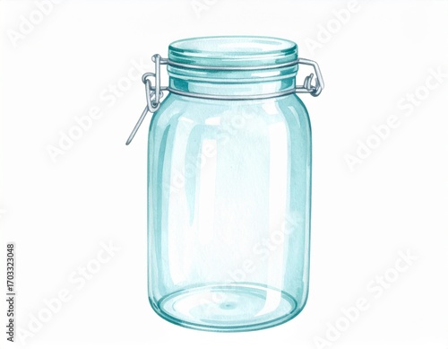jar, glasses, empty, container, storage, transparent, preserve, food, clear, lid, vintage, clip, metallic, kitchen, household, equipment, utensil, closeup, design, element, object, single, illustration, isolated, white, background, art, craft, drawing, vignetting, hand-made, retro, antique, rustic, country, style, decoration, decorative, graphic, image, still, life, classic, aged, old, fashioned, vessel