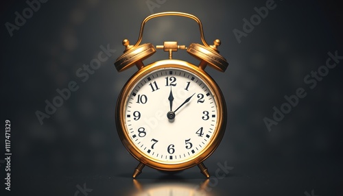 Antique Gold Alarm Clock Showing Midnight Time. A vintage gold alarm clock displays midnight. Its elegant design and subtle lighting evoke a sense of nostalgia and the passage of time.