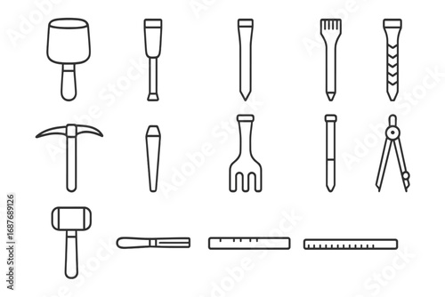 antique, stone, carving, tool, line, style, icon, mallet, flat, chisel, point, teeth, wedge, claw, hand, tracer, hammer, drill, rasp, levelling, stick, compass, text, label, isolated, transparent