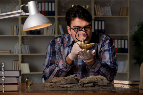 archaeologist, archaeology, ancient, excavation, archaeologic, history, science, dig, discovery, old, scientist, archaeology, man, paleontology, research, work, fossil, sand, explorer, antique, tool, exploration, stone, examining, equipment, remain, find, brush, artifact, anthropology, finding, historical, dirtied, archaeologic, evening, night, overtime, studying, magnifying, glasses, arabic, lamp, genie, lantern, gold, gold, silver