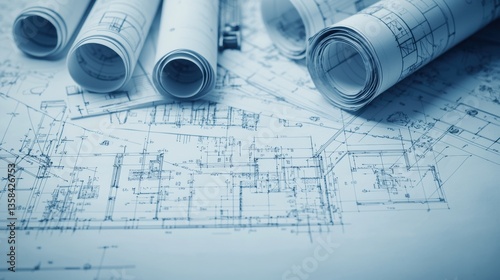 Architectural blueprint drawings and technical construction plans on drafting table with rolled up documents Engineering design building development and infrastructure project concept