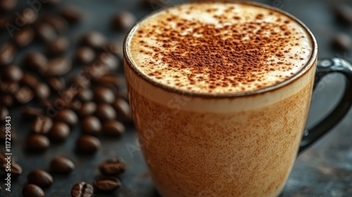 hot drink, cappuccino, mug, bean, drink, beverage, hot, chocolate, cocoa, cream, foam, espresso, caffeinated, breakfast, morning, energy, aroma, delicious, tasty, favor, rich, smooth, warm, comfort, cosy, relaxing, indulgent, brown, dark, food, cookery, cafes, eatery, barista, cup, roasted, ground, powder, texture