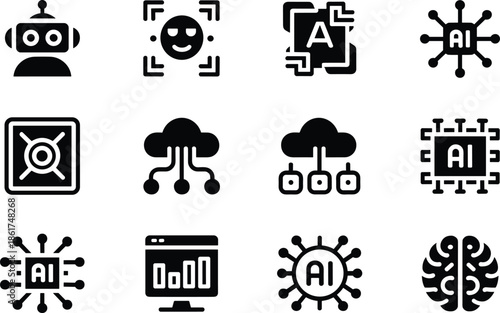 Artificial intelligence icons collection, AI technology symbols, machine learning cloud computing robotics analytics, black vector illustration isolated white background design