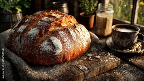 Artisan Bread & Coffee: A rustic scene of freshly baked bread and a cup of coffee on a wooden board, inviting warmth and comfort.