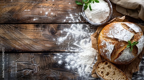 Artisan bread and flour on a rustic wooden background, text space