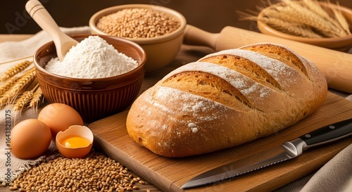 Artisan Bread Preparation with Fresh Ingredients and Rustic Charm on a Wooden Board, Perfect for Baking Enthusiasts and Food Photography