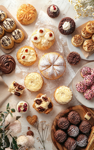 pastry, dessert, confection, baked goods, bakery, food photography, sweet, artisan, handcraft, texture, favor, arrangement, variety, delicious, tasty, epicure, indulgence, presentation, treat, bakery goods, confectionery, baking, sugar, craving, homemade, delightful, delectable, tempting, pleasing, appetising, satisfying, rich, colourful, topview, visual, closeup, arrangement, assortment, different, numerous, many, abundance, plentiful, feast