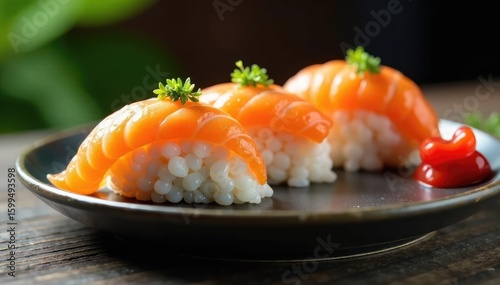 Artisanal sushi on white, elegant presentation, texture, clean, sashimi