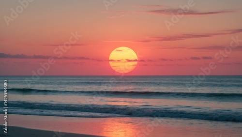 As the first light of dawn emerges, a blazing orange sun ascends from the blue ocean waters, coloring the sky and waves with stunning golden shades.