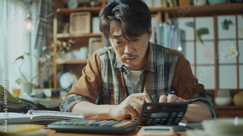 Asian businessman calculating checking balance and costs by using calculator in workplace. Young male sitting at desk and doing paperwork for pay taxes. Business people calculate from bills at office.