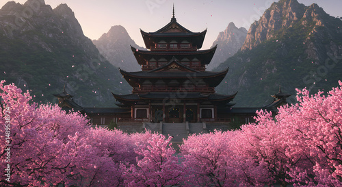 temple, pagoda, architecture, mountain, cherry, blossom, pink, nature, asian, landscape, sunrise, sunset, tree, flower, design, illustration, digital, building, travel, vacation, scenic, colours, beauty, artistic, image, background, poster, graphic, visual, modern, isolated, copy space, traditional