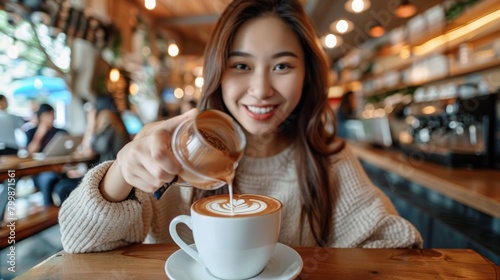 Asian woman working using laptop computer at coffee shop Hand holding coffee cup on wooden table Remote work, work from anywhere Independent lifestyle, remote work