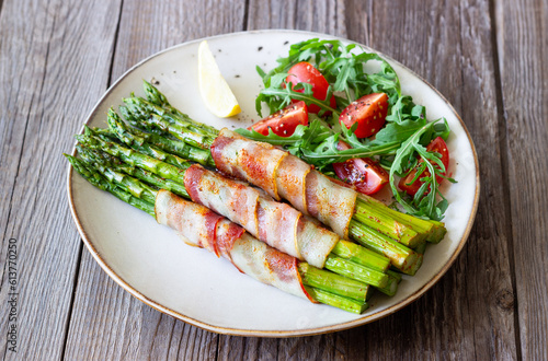 Asparagus baked with bacon and arugula and tomato salad. Healthy eating. Diet.