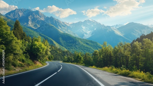 road, mountain, landscape, travel, mountain, sky, highway, nature, asphalt, snow, summer, canada, way, cloud, view, trip, tree, drive, forest, alps, route, line, vacation, tree, empty, and, green, with, natural, under, blue, generative