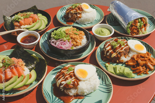 Assorted Hawaiian poke bowls and local fusion dishes served with rice, avocado, and sauces on colorful plates