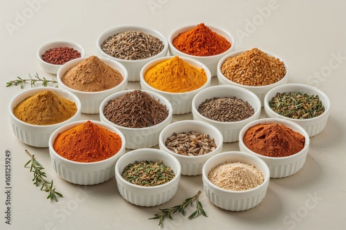 Assorted herbs and spices displayed in white ceramic dishes. Ingredients for cooking and flavoring. Vibrant natural seasonings.