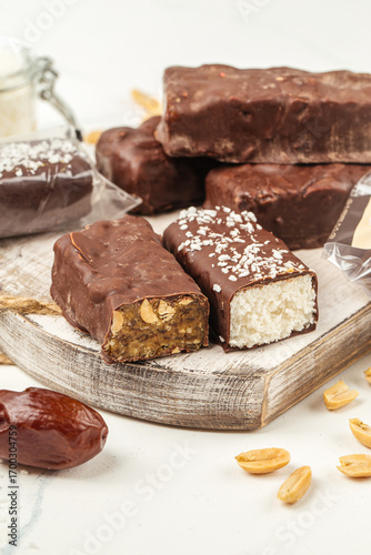 Assorted homemade chocolate-covered protein bars with peanut and coconut filling, cut in half to show texture, arranged on a rustic wooden board with dates and peanuts
