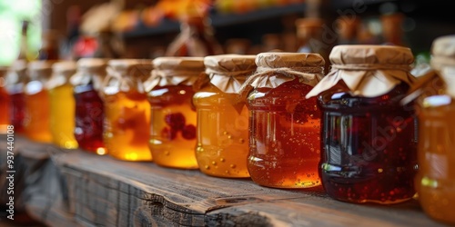 Assorted honey jars on a rustic shelf in a market, showcasing different colors and varieties of fresh, natural honey