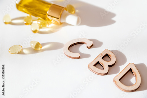 Assorted medical cannabis products with capsules and CBD oil isolated over white background. There is word CBD