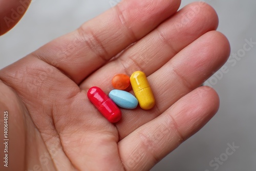 Assorted pills held in a hand. Colorful capsules in varying shades of red, orange, yellow, and blue