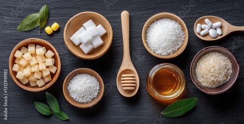 Assorted Sweeteners and Sugar Options in Wooden Bowls on Dark Background for Culinary and Health Applications