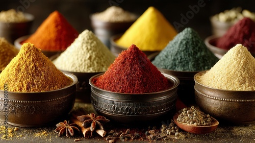 Assortment of colorful spices in metallic bowls on a dark background. Close up view showcasing vibrant hues and textures.