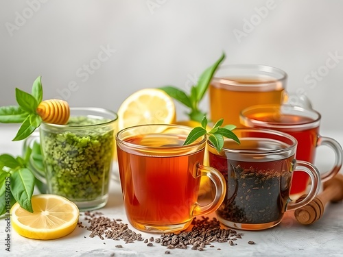 Assortment of Herbal Teas in Glass Mugs with Lemon, Honey, Herbs, and Ingredients - Refreshing Beverages.
