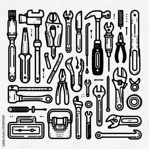mechanic, tool, doodle, hand-drawn, illustration, icon, set, wrench, hammer, screwdriver, plier, toolbox, repair, maintenance, workshop, equipment, instrument, utility, engineering, industry, construction, carpenter's shop, craft, manual, service, collection, variety, isolated, graphic, pictogram, symbol, industrial, technician, builder, handyman, garage, project, fix, assemble, bricolage, professional, essential, adjustable, spanner, cutter, chisel, file, measuring