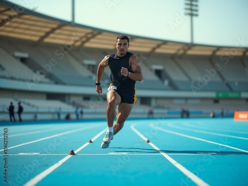 athlete, sprinting, running, track and field, stadium, motion, speed, fitness, competition, exercise, activewear, healthy lifestyle, determination, training, blurred background, sharpened, race, energy
